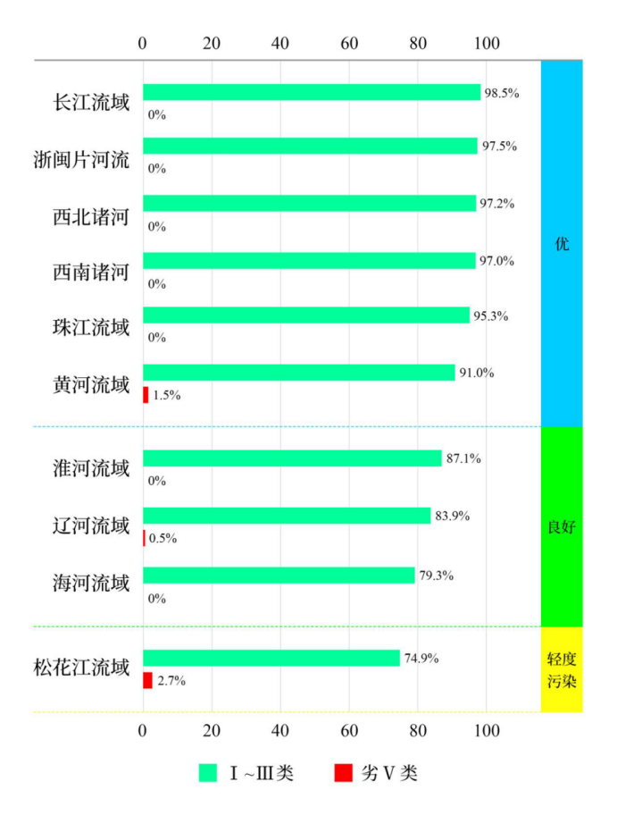 1—12月,長江、黃河、珠江、松花江、淮河、海河、遼河等七大流域及西北諸河、西南諸河和浙閩片河流水質(zhì)優(yōu)良(Ⅰ—Ⅲ類)斷面比例為91.7%,同比上升1.5個百分點;劣Ⅴ類斷面比例為0.4%,同比持平。主要污染指標為化學需氧量、高錳酸鹽指數(shù)和五日生化需氧量。其中,長江流域、浙閩片河流、西北諸河、西南諸河、珠江和黃河流域水質(zhì)為優(yōu);淮河、遼河和海河流域水質(zhì)良好;松花江流域為輕度污染。