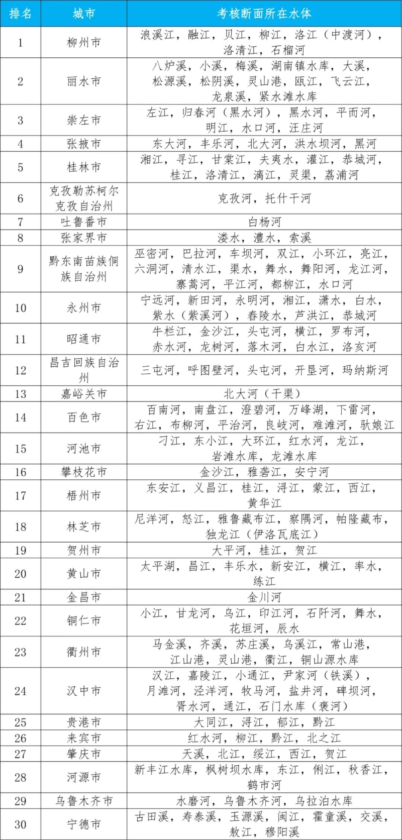 1—12月,全國地級及以上城市中,柳州市、麗水市和崇左市等30個城市國家地表水考核斷面水環(huán)境質(zhì)量相對較好(從第1名至第30名),五家渠市、商丘市和開封市等30個城市國家地表水考核斷面水環(huán)境質(zhì)量相對較差(從倒數(shù)第1名至倒數(shù)第30名),見附表1—2。