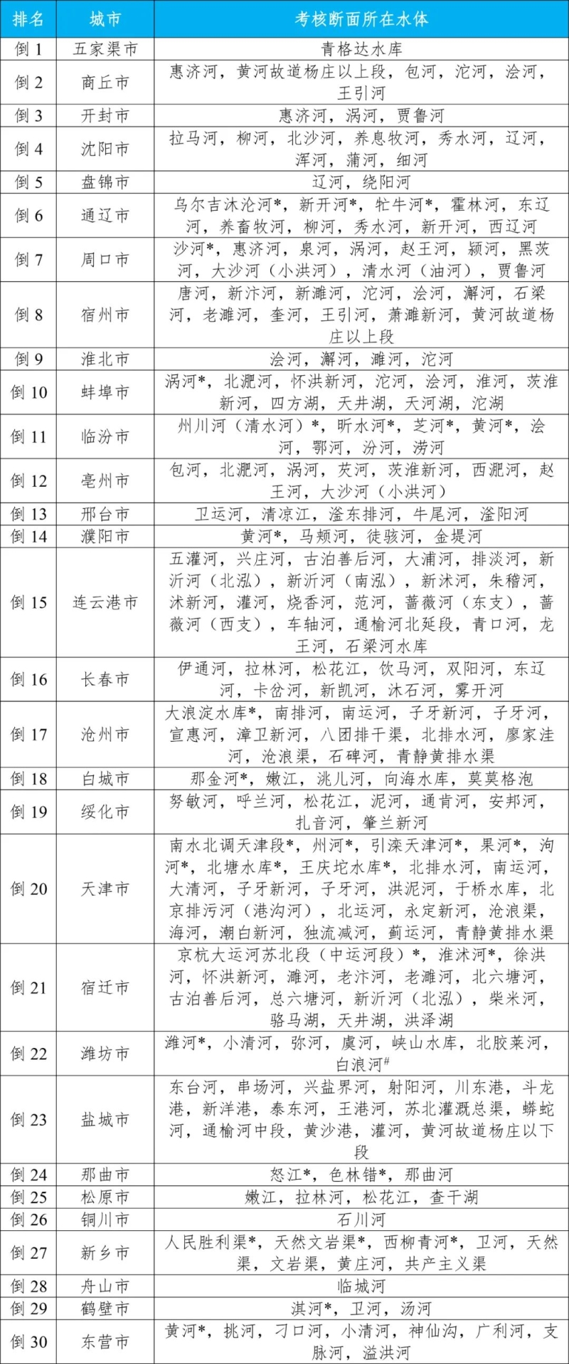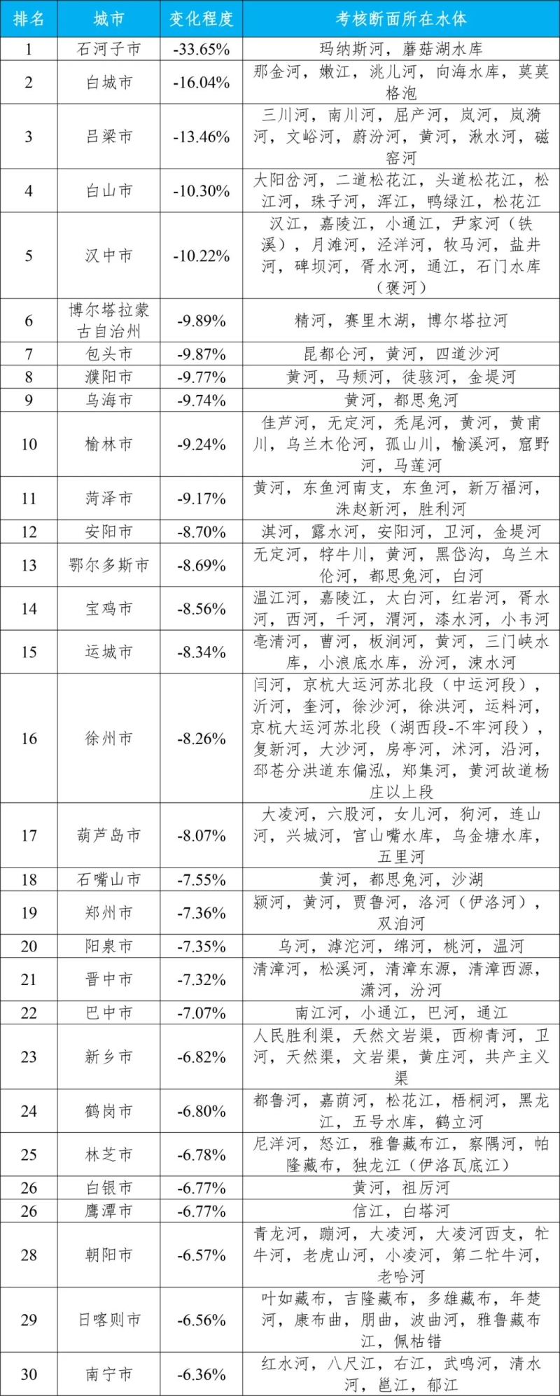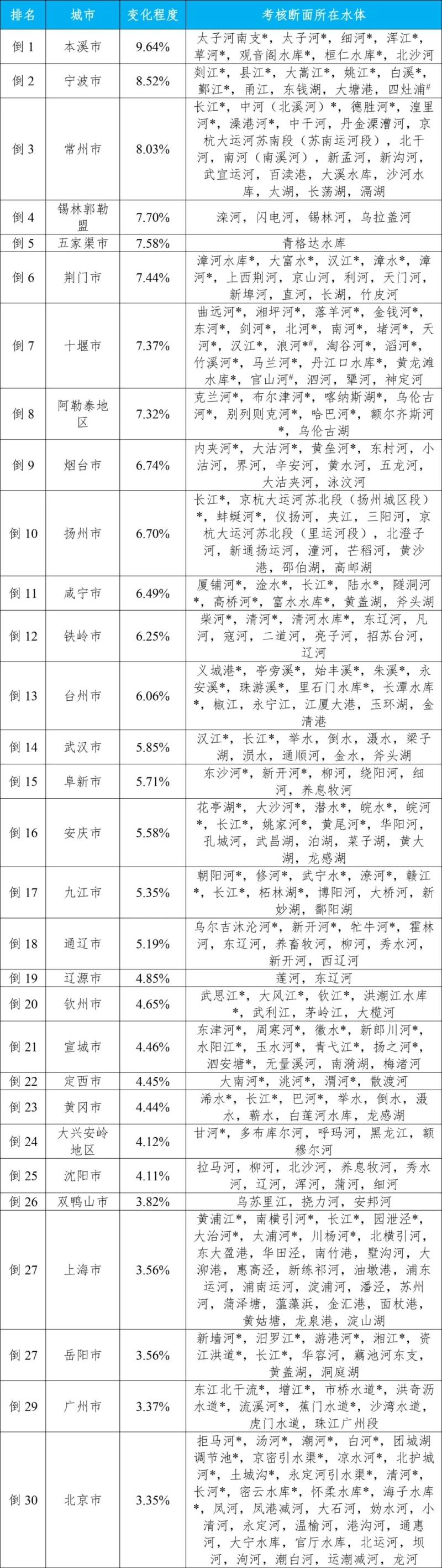 石河子市、白城市和呂梁市等30個城市國家地表水考核斷面水環(huán)境質(zhì)量變化情況相對較好(從第1名至第30名),本溪市、寧波市和常州市等30個城市國家地表水考核斷面水環(huán)境質(zhì)量變化情況相對較差(從倒數(shù)第1名至倒數(shù)第30名)。見附表3—4。